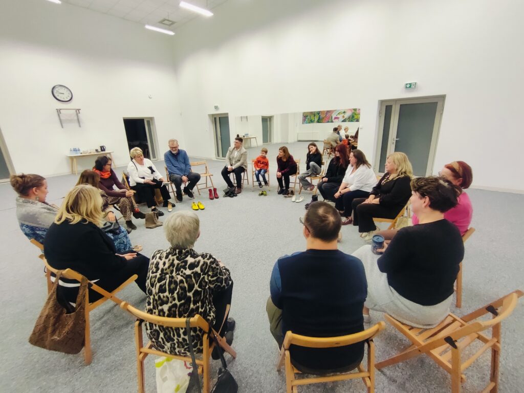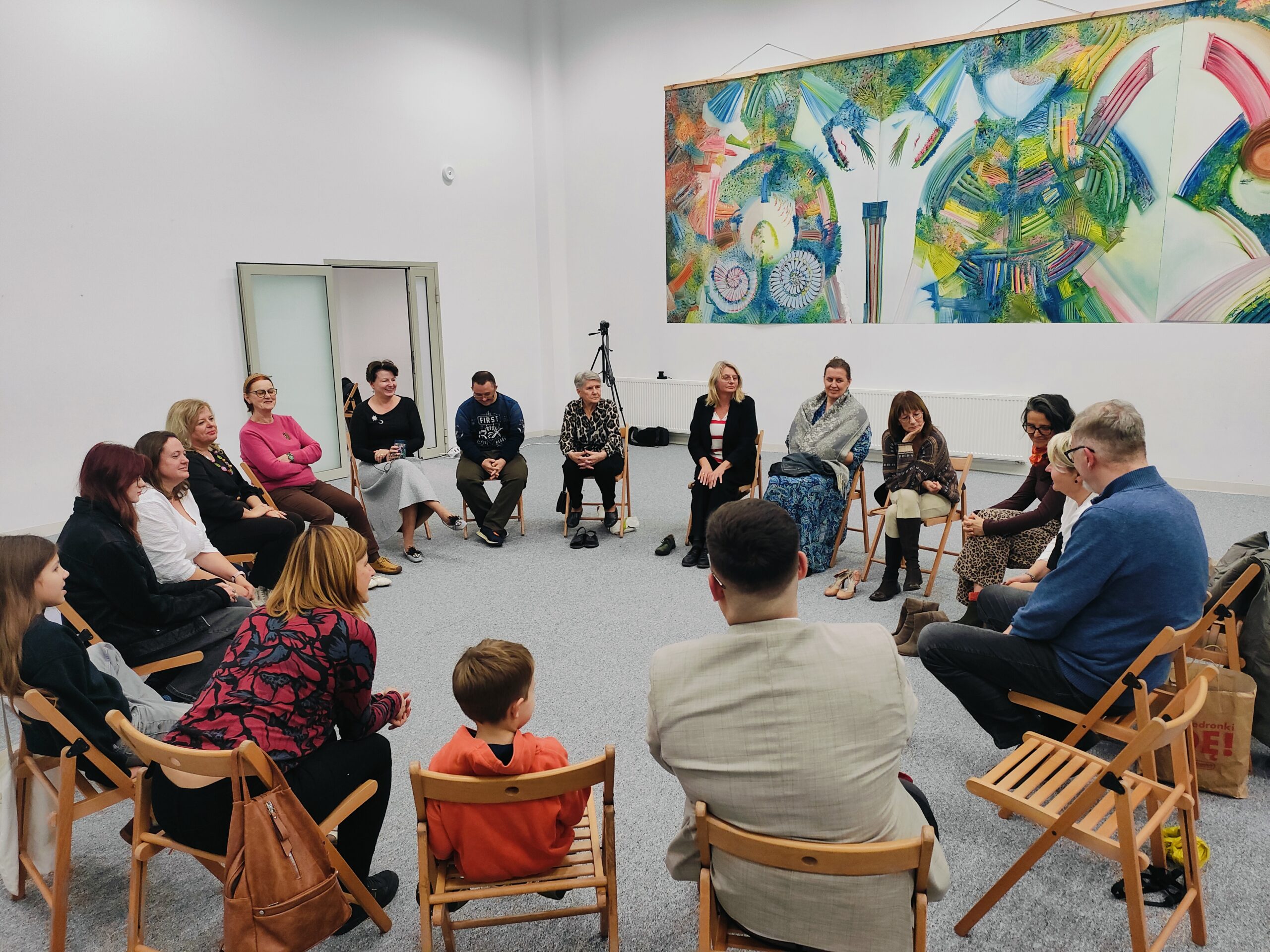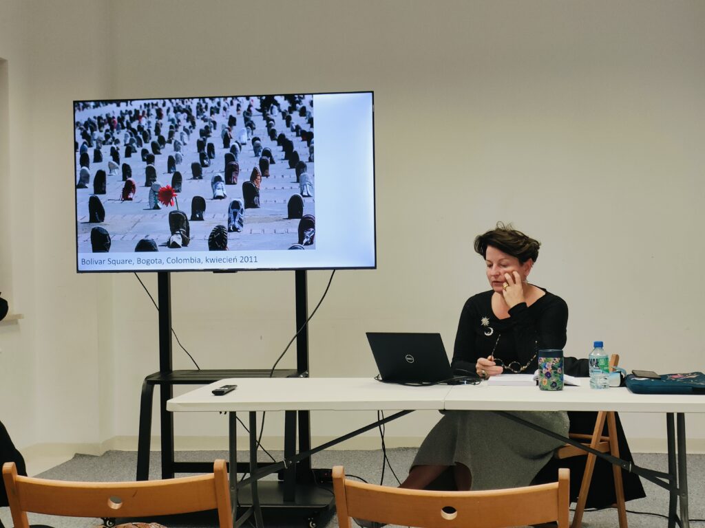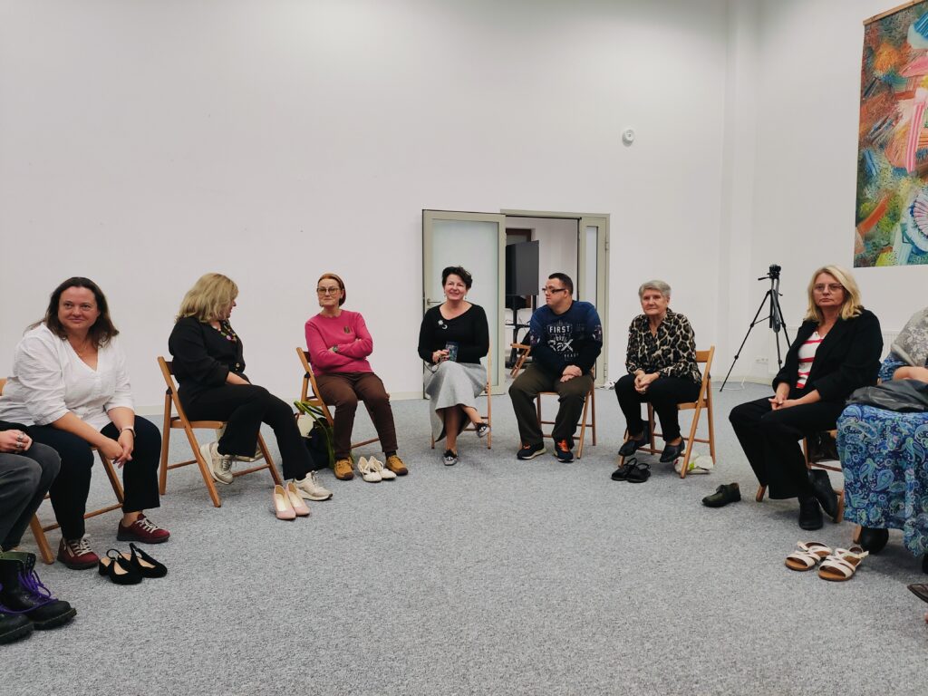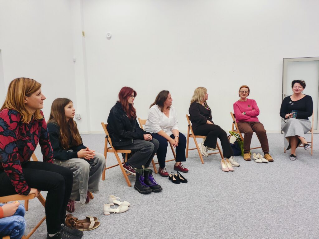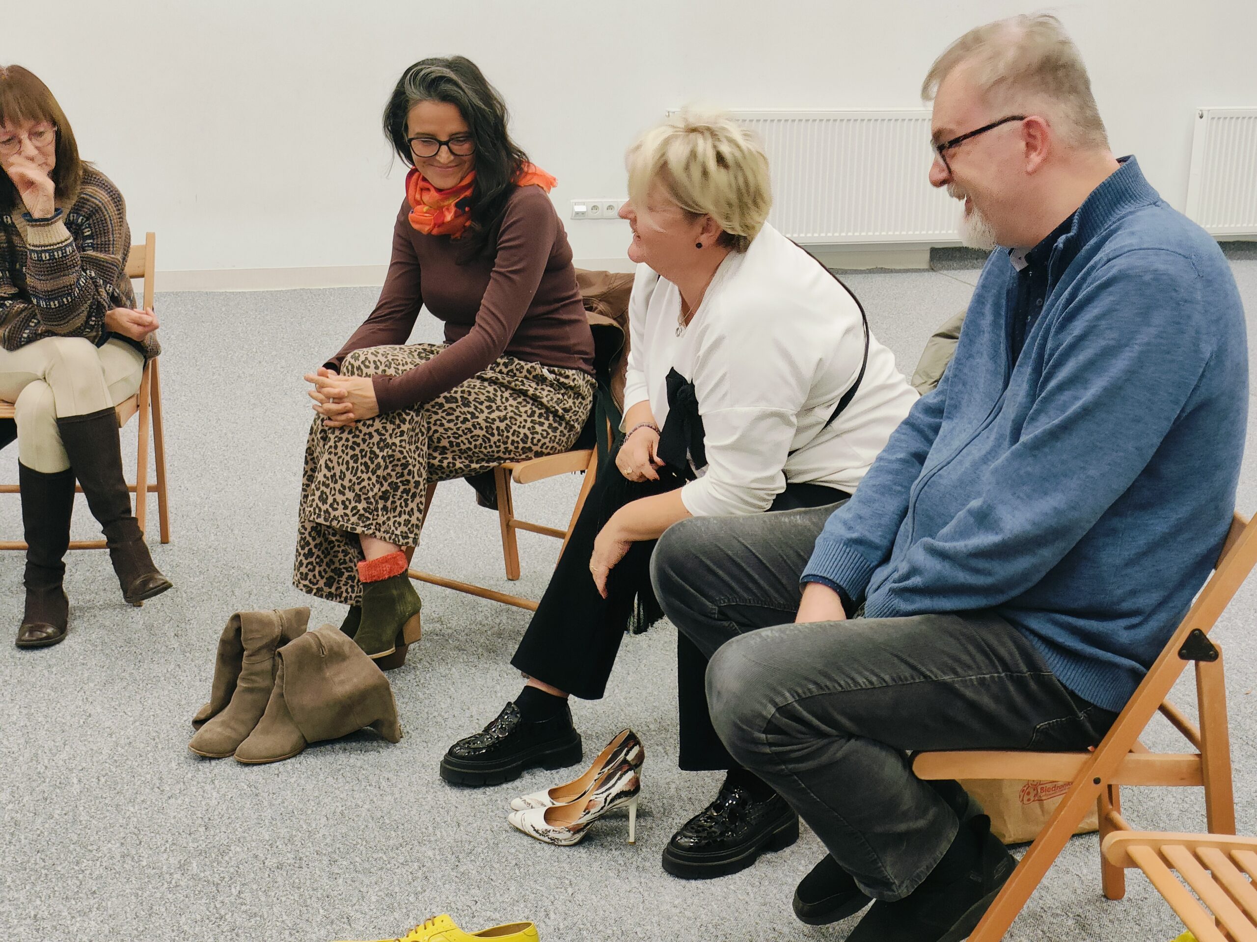 Po wykładzie, w ramach warsztatów, każdy opowiedział o ważnych dla siebie butach, pokazując je innym. Był to rodzaj performance’u, który zakończył nasze spotkania w ramach projektu „Sztuka współczesna – poznawanie i uczestnictwo”