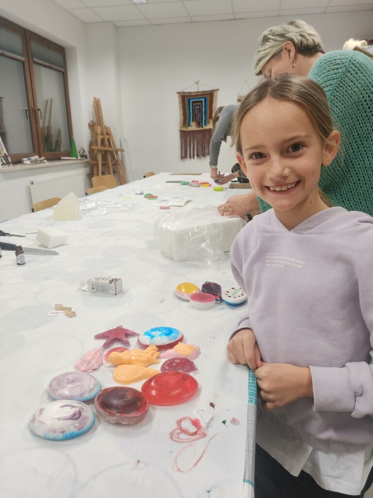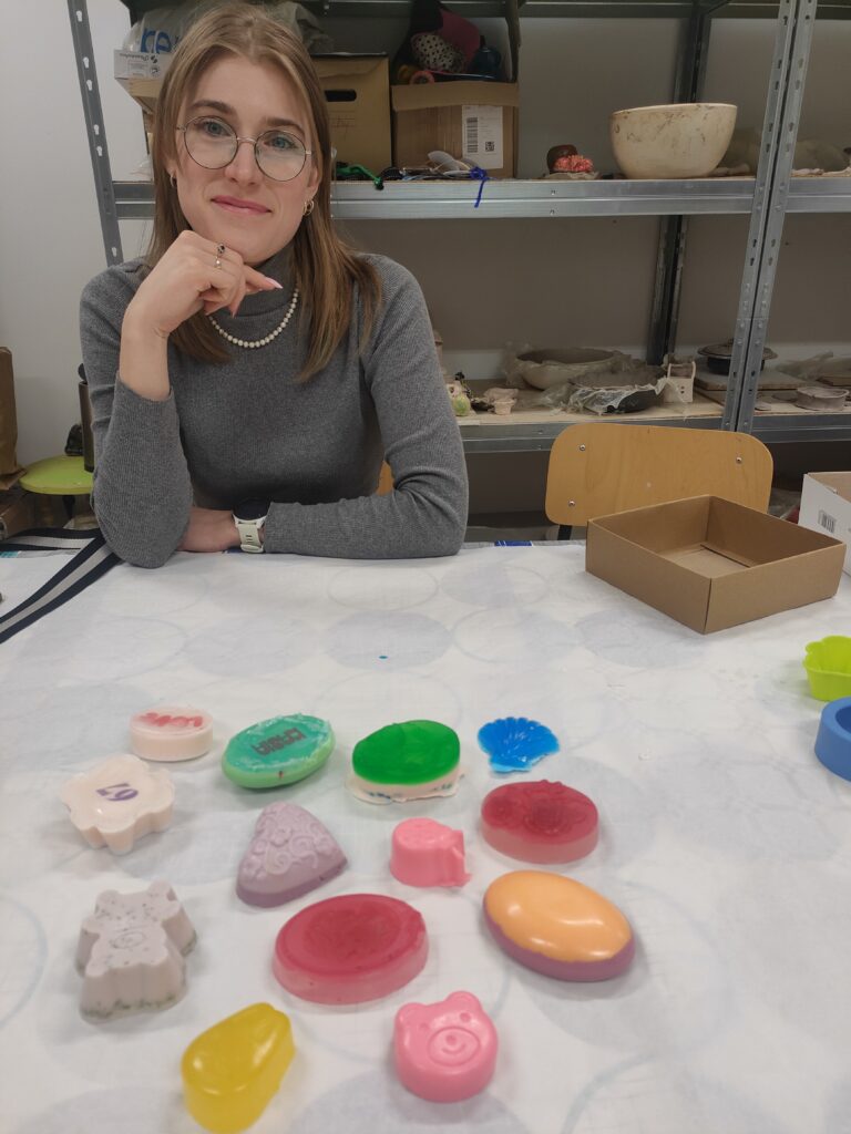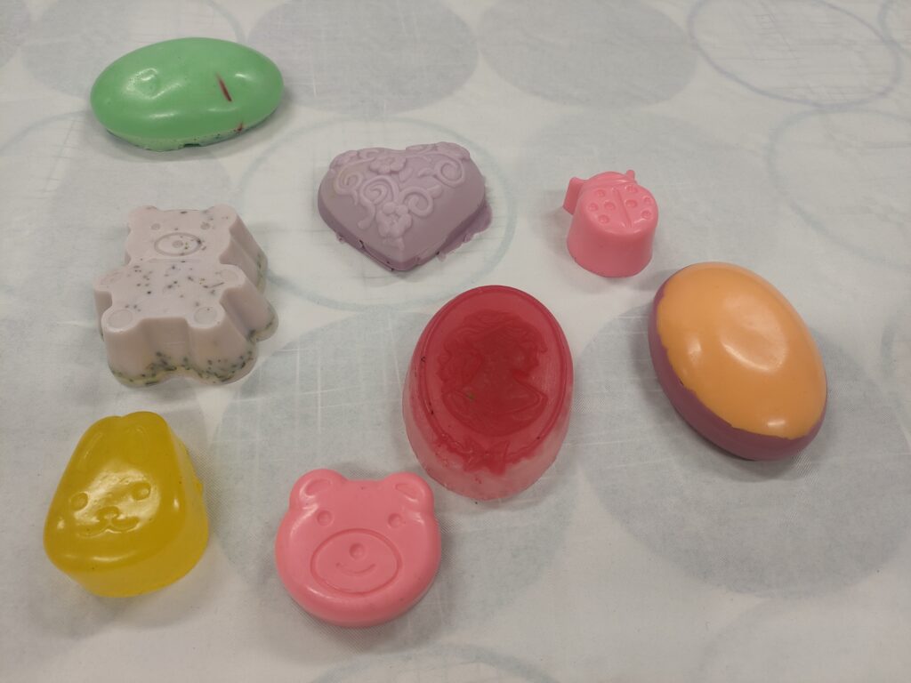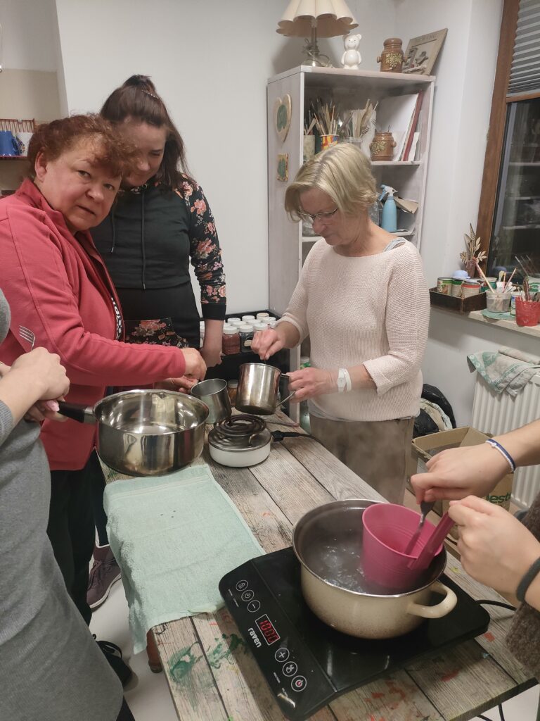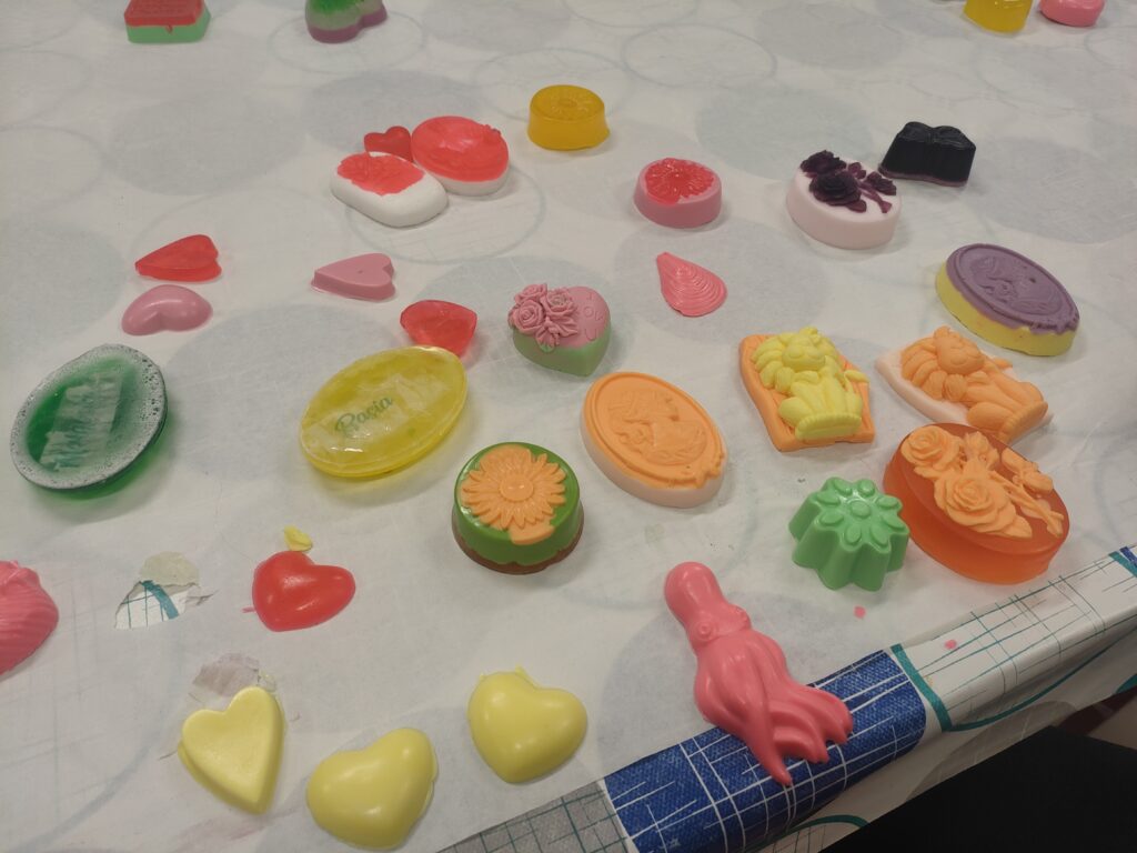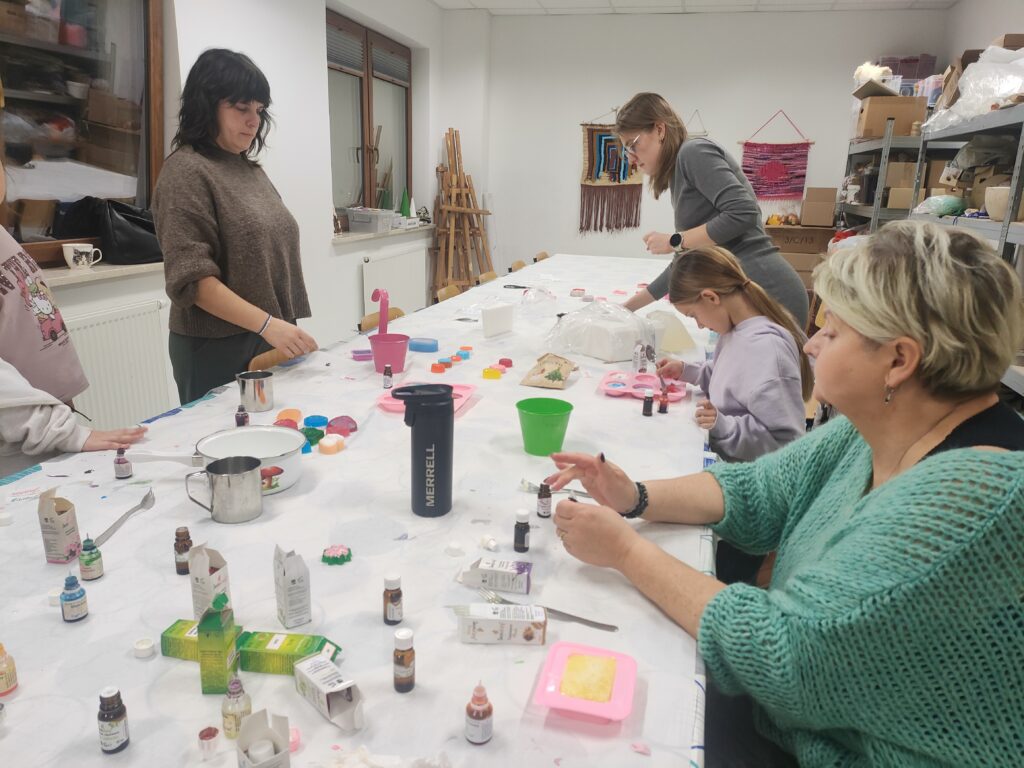 Relaks, dobra zabawa i piękne efekty, tak możemy podsumować warsztaty tworzenia mydełek glicerynowych. 🧼🤩 Uczestniczki roztapiały bazę glicerynową, dodawały do niej barwnik i olejek zapachowy i umieszczały przygotowana miksturę w foremkach. Dzięki różnym kształtom foremek udało się stworzyć fajne kompozycje. Każde mydełko ma swój urok i będzie cieszyć użytkownika.