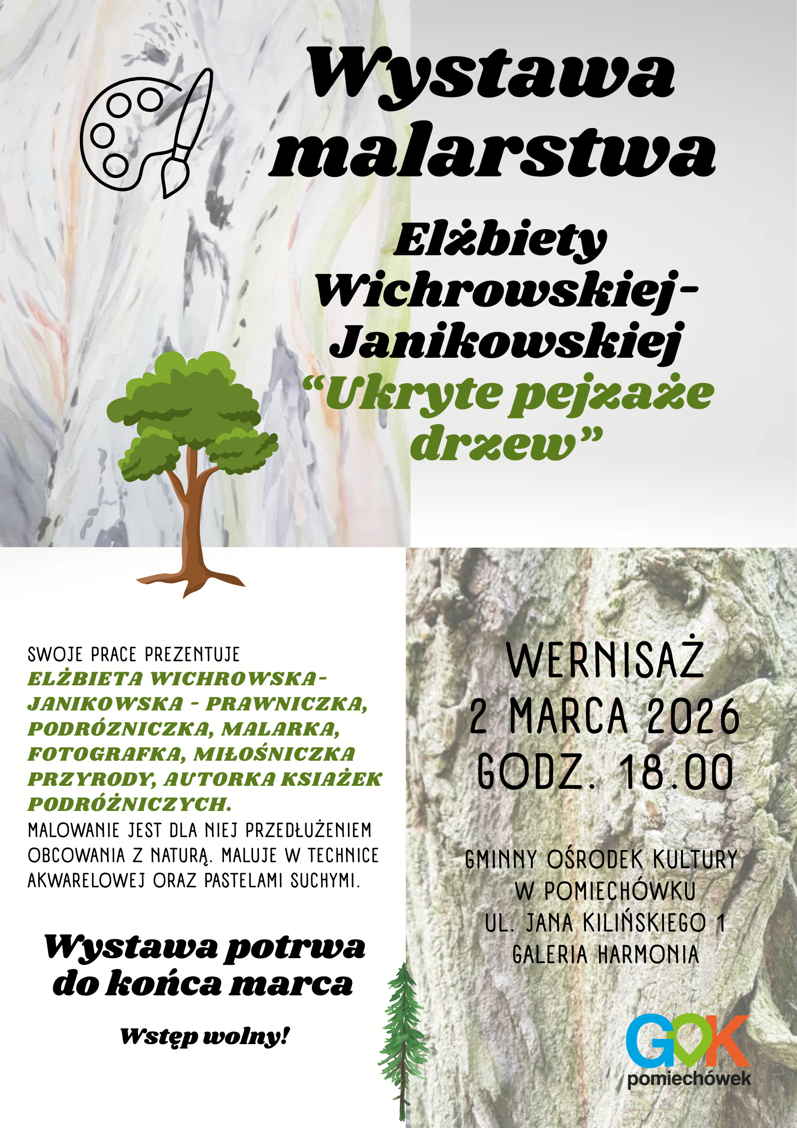 Jednym z głównych celów realizowanych przez instytucje kultury, jakimi są gminne i miejskie ośrodki kultury, jest upowszechnianie sztuki i wiedzy na jej temat. Jeśli mamy na myśli sztukę w rozumieniu prac plastycznych, najlepszym miejscem na jej prezentację będzie galeria, specjalnie w tym celu utworzona lub galeria wygospodarowana na potrzeby prezentacji z innego pomieszczenia, na przykład holu. W Gminnym Ośrodku Kultury w Pomiechówku, w oddzielnym, specjalnie przygotowanym pomieszczeniu, powstała Galeria o nazwie Harmonia. Galeria umożliwia prezentowanie prac zarówno zapraszanych artystów, jak też prezentowanie dorobku miejscowych twórców, także amatorów. W Gminnym Ośrodku Kultury działają pracownie plastyczne i tworzone w nich prace będą również prezentowane w miejscowej Galerii. Ale przede wszystkim ma ona służyć otwieraniu się na świat sztuki, edukowaniu mieszkańców, namawianiu ich do wspólnych spotkań poświęconych sztuce. Zachęcamy do udziału w wernisażach organizowanych przez Gminny Ośrodek Kultury w Pomiechówku, inaugurujących kolejne wystawy. Zapraszamy do odwiedzania Galerii Harmonia znajdującej się w holu obok kina. Wszystkie informacje na temat wystaw będziemy podawać na bieżąco na naszej stronie internetowej oraz w mediach społecznościowych. Wystawy będą dostępne dla odwiedzających w godzinach pracy Gminnego Ośrodka Kultury oraz w godzinach pracy kina.