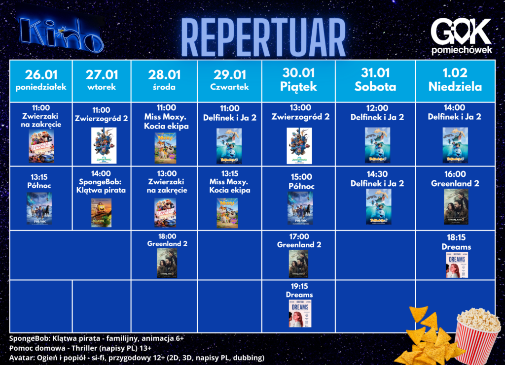 Zapraszamy dzieci z gminy Pomiechówek na ferie z naszym kinem.W drugim tygodniu ferii codziennie wyświetlamy seanse dla naszych najmłodszych mieszkańców.Zapraszamy!